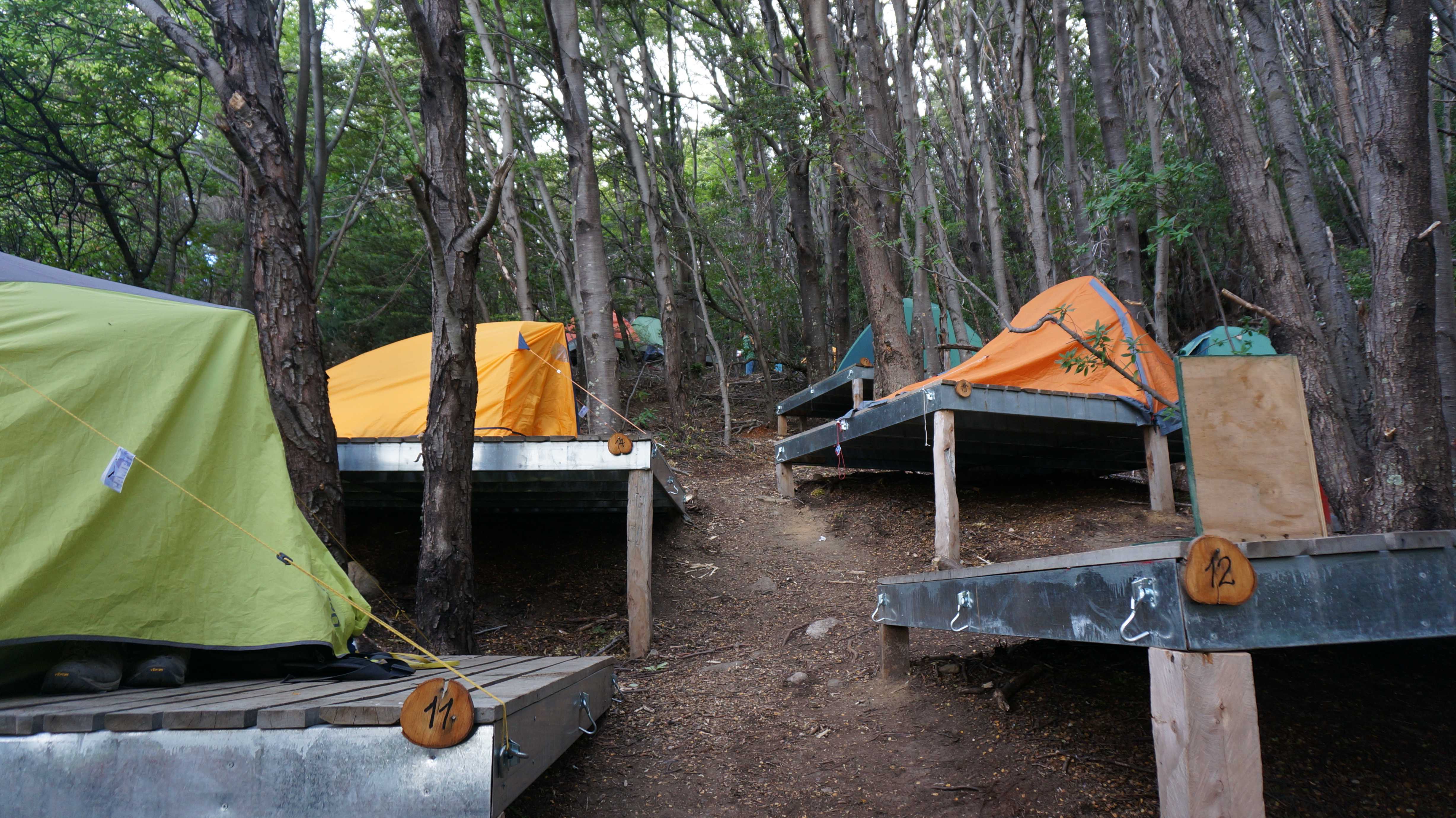 Despite our aching feet when we returned to camp Italiano, we had no other choice but to strap on all our gear and continue walking east along the “W” until we could find a paid camp. Just that week the free campsites had introduced a reservation system, which no one had informed us of, so settling in at Italiano for the night was not an options for us. Within an hour we came to camp Frances, the newest campsite along the trail. We set up our tent on a platform jutting from a hill.
