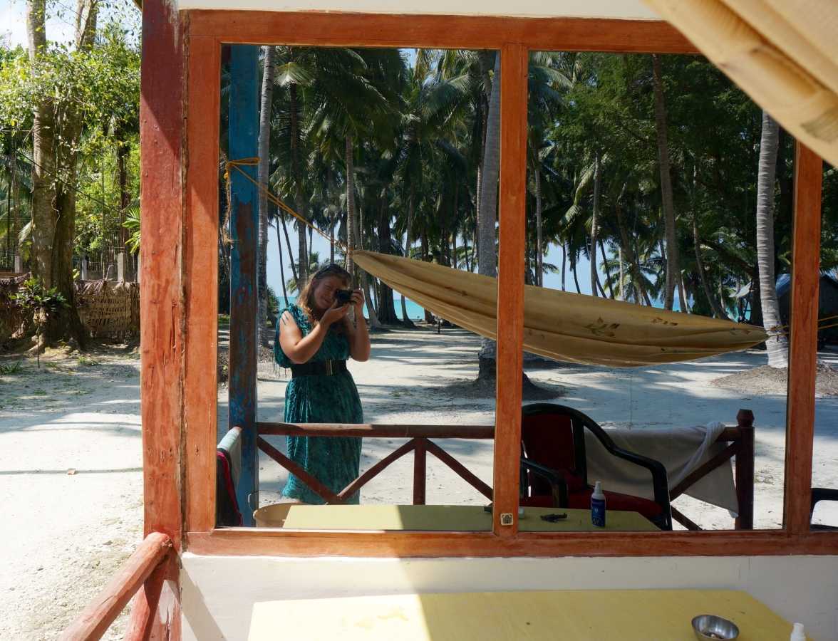The best feature of the room was the giant window that looked out over a scattering of palm trees with the turquoise Andaman Sea in the background. Privacy was not an issue because if someone looked at the window from outside they only saw a reflection of themselves. This was good because people were often walking in front of our room to go between the restaurant, a popular spot with the local men because it had a liquor license, and the path that led to the main road. It was also a source of entertainment as people would stop in front of our room and use the window to fix their hair or pick things out of their teeth without realizing we were standing just feet away from them on the other side.