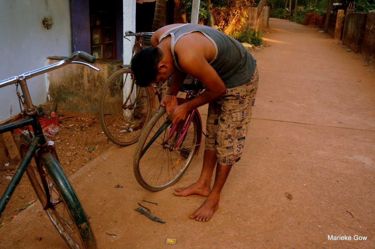 With two bicycles somewhat road worthy, Marieke and I set off to rediscover the magical sunset at the local beach we had shared with Marg and Swami G the previous night. Easily finding the turnoff down the dirt road towards the beach, pretty soon we heard a very loud POP! Alas, Marieke’s rear tire blew. Alerted to the sound, a kind man ran out of his house and pointed down the road. Hopeful, after two minutes of walking we found just what we were looking for: a man fixing bicycles 20 R ($0.40 CAD) and ten minutes later we had a patched tube and were on our way again.